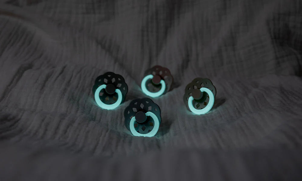GLOW ONLY OPTIONS: Glow effect lasts for approximately 8+ hours. Activate by holding the pacifier close to a light source for 5-10 seconds.