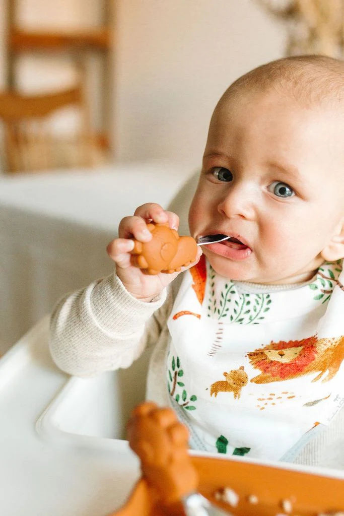 When your baby starts using his or her utensils, there’s always a steep learning curve (read: a big mess). Our toddler learning spoon and fork set is perfectly sized for little hands to encourage self-feeding with chunky easy-grab handles. Made of buttery smooth premium food-safe silicone and SS304 stainless steel, this set is available in our exclusive animal characters.