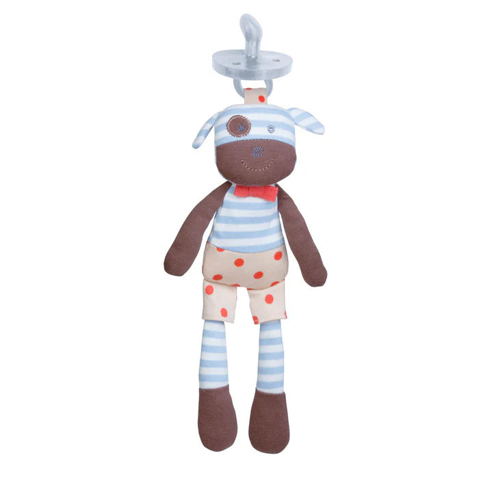 A mini plush, a rattle, and a crinkle-y fun pacifier-keeper — all rolled into one! Made with soft organic cotton jersey and tactile details like fabric knots, cushy ears, and adorable accessories.