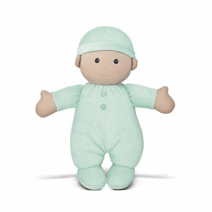 My First Baby, a super soft organic cotton baby doll for infants, loves to cuddle, has sensory features that entertain and promotes social emotional development. It squeaks with a light squeeze and gently rattles with a little shake,a perfect first buddy and a great baby shower gift or add-on.