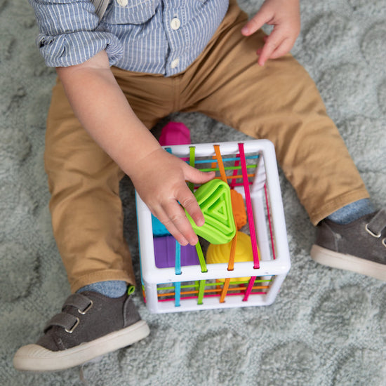An incredibly unique shape-exploration experience! The six chunky shape blocks are each designed with fascinating textures that are sure to thrill the fingers. There's a cube, a diamond, a sphere, a triangle, a flower, and the happy Fat Brain logo... But the best part? As kids push the shapes through the elastic bands of the cube, curiosity is sparked and young minds can't help but explore, experiment, and discover. It's beautifully simple and amazingly mind-expanding! Play freely with InnyBin.