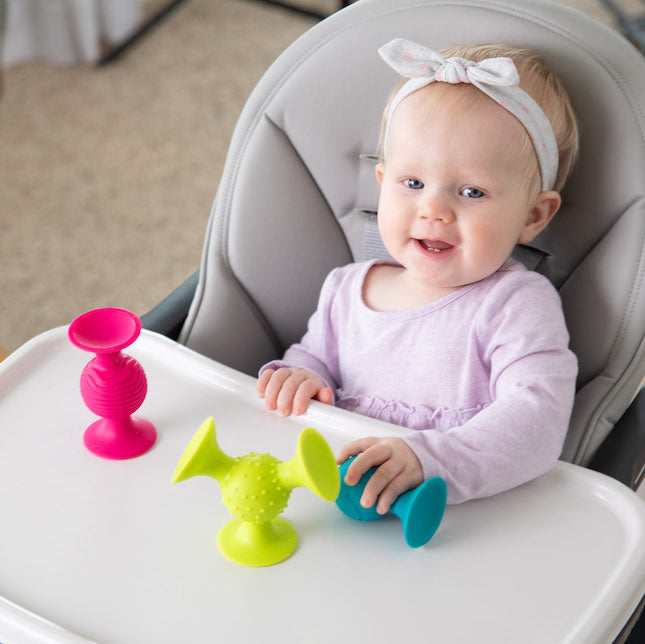 What happens when babies and toddlers encounter playful colors, fun sounds, fresh tactile experiences and super-suction? Meet pipSquigz, a set of three Fun Little Suckers for ages 6 months and up. Adored by baby and parents alike, pipSquigz are perfect for the stroller, highchair, bathtub, and anywhere-travel. Simply push pipSquigz down onto any smooth surface and watch baby interact with this high-quality silicone suction toy. With super-suction, each shape can be tugged, pushed, shaken and pulled. Or, push and stick the shapes together for new play experiences. Babies delight in the versatile movement, sound and texture. Pediatricians note sensory integration as a crucial developmental milestone for infants. pipSquigz are right on target: The wavy ridges, bumps, and debossed, smiling face stimulate the fingers. The "just right" rattles and the POP of the suction cups thrill the ears. The brilliant colors mesmerize the eyes while the soft, BPA-free silicone invite sore gums to be soothed. pipSquigz is an all-in-one sensory learning experience! Not to mention, they're also wonderfully portable and completely dishwasher safe. Discover peace of mind for parents and teething babies with pipSquigz.
