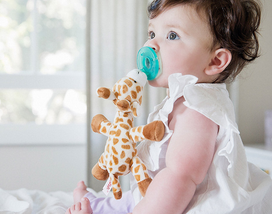 - Plush animal makes it easy for baby to grasp and manipulate the pacifier.
